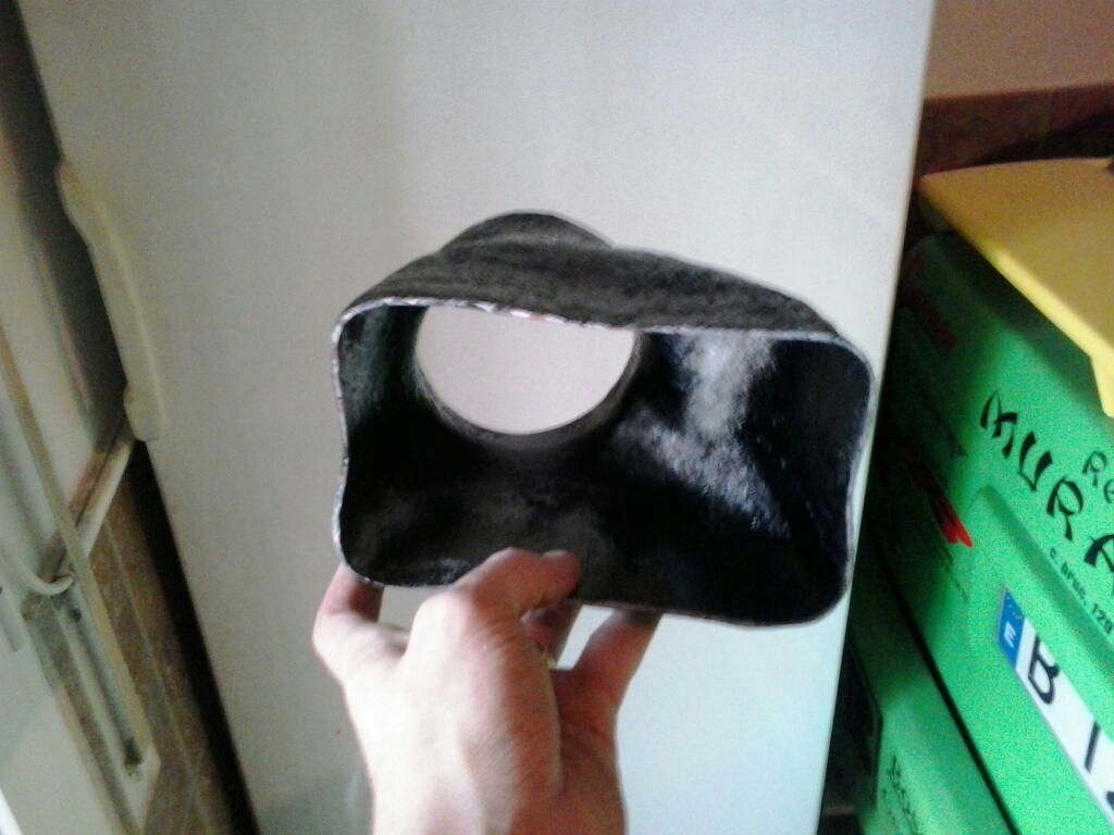 - Caja del filtro de aire: la parte de arriba de la caja tiene un tubo cuadrado por el que el motor aspira el aire; quería cambiarlo por una trompeta de admisión con la finalidad que el coche aspirase mayor cantidad de aire y éste a su vez entrase a mayor velocidad, sin embargo después de mirarlo y hacer diversas pruebas con aluminio se me hizo complicado pasar del tubo cuadrado a la sección redonda de la trompeta, y los resultados no eran óptimos, de manera que finalmente calenté con cerillas el tubo cuadrado para darle forma de trompeta, no es un gran avance pero creo que irá mejor que con el tubo cuadrado de origen: