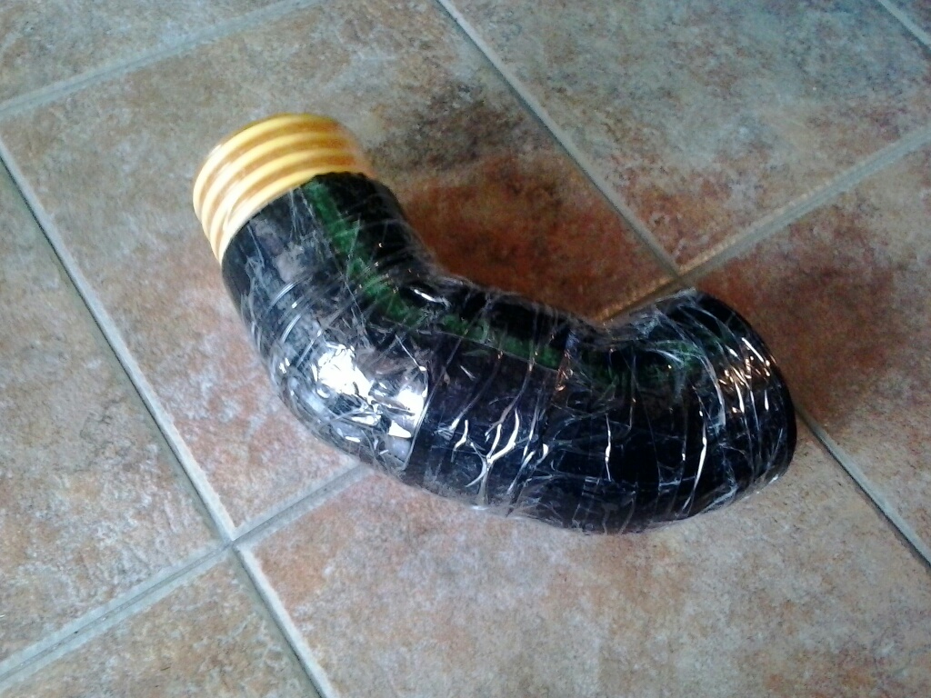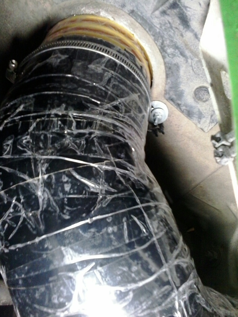 De la campana pasé a tubo de 10cm puesto que es el diámetro del agujero que hay en el chasis y que da a la caja del filtro de aire. Estuve buscando tubos de 10cm flexibles y lisos por dentro (para evitar al máximo las turbulencias) pero poca cosa encontré, con lo que finalmente me hice con dos codos de canalera de PVC de 45 grados, y un trocito de tubo de 10 para pasar por el hueco del chasis (el Pvc no pasaba por poco). Lo pegué con pegamento especial y lo encinté para que no se viese que son tuberías de PVC. Estéticamente no es la monda, pero creo que la cantidad de aire que pueda coger va a ser mucho mayor que con el tubo de 7 que llevaba. Eso sí, tube que modificar ligeramente la caja de debajo del filtro de aire.
