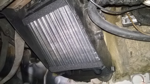 Para quitar el tornillo de abajo, o lo hacemos a tientas, porque no se ve, o metemos la cabeza abajo del todo para poder ver qué estamos haciendo. Lo quitamos y ya podemos tirar sin problema del calefactor, como dice el manual de taller, manteniéndolo lo más horizontal posible para no derramar mucho líquido. Mejor tener a mano un barreñillo o mucho papel absorbente.
