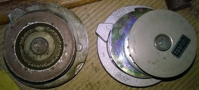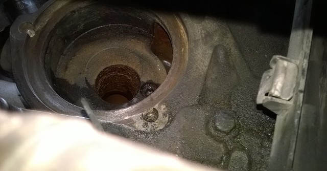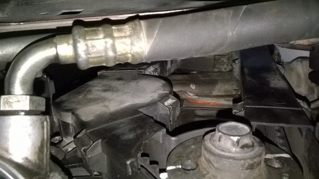 Para quitar la grapa superior es mejor soltar la articulación de la trampilla esa que se ve oxidada, para poder ponerla en la posición que se ve en la foto. Si no lo hacemos cuesta mucho llegar con la llave de vaso a esos 2 tornillos hexagonales, y podemos doblar la trampilla, o, lo que es peor, partir sus sujecciones de plástico.