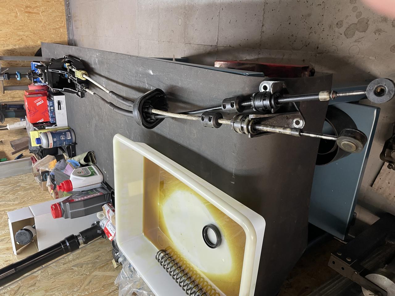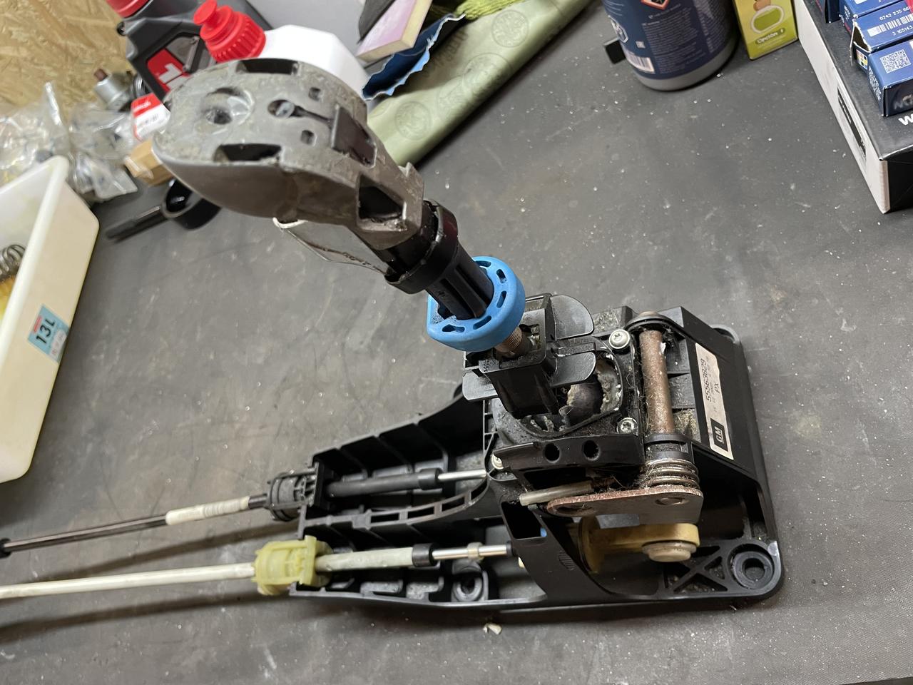 Otra maniobra que tengo para entonces es pasar la selectora a cables. Tengo una torreta de F17 que ya tuve montada en el Kadett, que era una gozada. Me faltaba la selectora. Generalmente se conoce que necesitas una selectora de Vectra C 1.8i, pero en realidad el abanico es bastante más amplio. La clave reside en que las selectoras de Opel, "estiran" del cable cuando se mueve la palanca al carril de 1a y 2a, a diferencia, por ejemplo de una selectora del grupo VAG, que empujan el cable en esta situación. Avisté en el desguace un Astra J CDTI y me llevé la selectora, de hecho es de una M32, pero el patrón de marcha atrás es igual que las de 5 marchas, por lo que me la llevé para probar y efectivamente se puede montar sin problemas y mueve la torreta de la F17. La diferencia, es la longitud de los cables, que me va a tocar recortarlos. Ya expondré el cómo hacerlo, de momento, el material para pruebas: