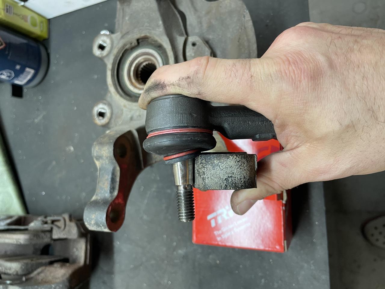 Otra más, pero esta la tengo que llevar a hacer, es invertir las rótulas de dirección para corregir el bump-steer. Al bajar el coche 60 mm el eje delantero, los tirantes de la dirección apuntan a la luna, y no trabajan de forma mínimamente paralela a la línea del suelo. Esto, tiene dos consecuencias, una, que en pleno apoyo el coche tiende a abrir la rueda exterior por lo que, en lenguaje llano, "gira menos". La segunda, es que los esfuerzos al girar, se disparan. No tiene mucho sentido que un coche de 800 kg y una desmultiplicación de dirección de seguramente 20:1, tenga semejante nivel de esfuerzo calzando una mísera 175 de goma delante. Al final todas estas cosas van haciendo mella.