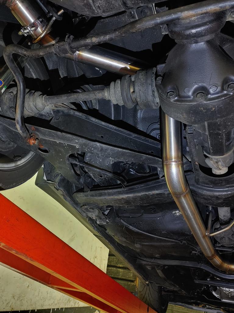 Decidí juntar las dos lineas originales de 50mm, en una única linea de inox de 63mm sin silenciadores intermedios. No estoy seguro que fuera el mejor diseño de escape para este motor, pero por ahora es lo que hay: