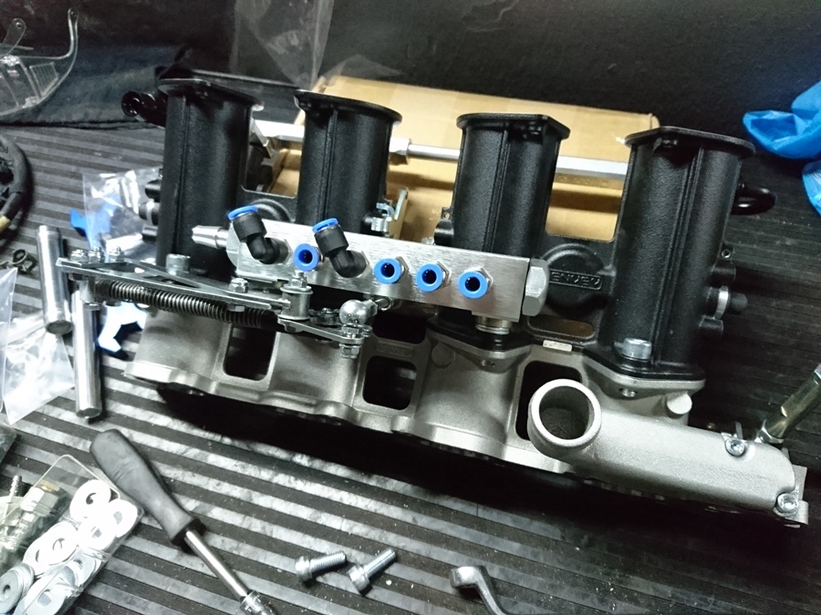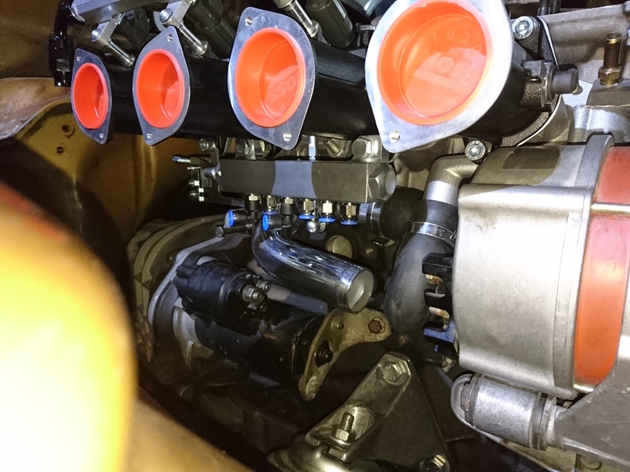La caja, aunque es genérica, hubo suerte de que tiene sujección sencilla a los ITB. Ahora me falta taladrar y roscar cada colector para meterle sus conectores. En la caja entran 4 macarrones de cada cilindro y salen 1 para el regulador de presión de gasofa, 1 para el MAP de la Megasquirt y 1 más gordo para el servofreno.