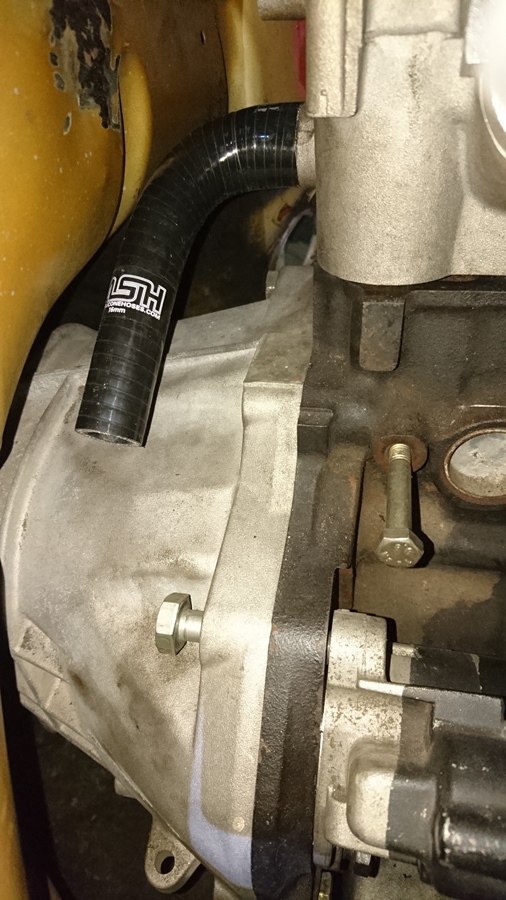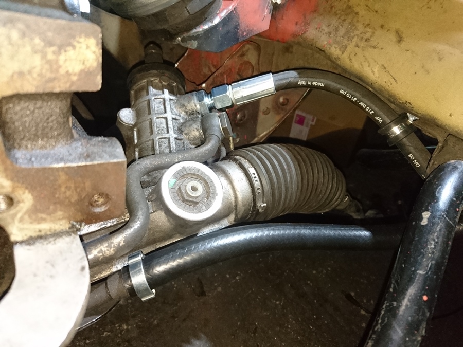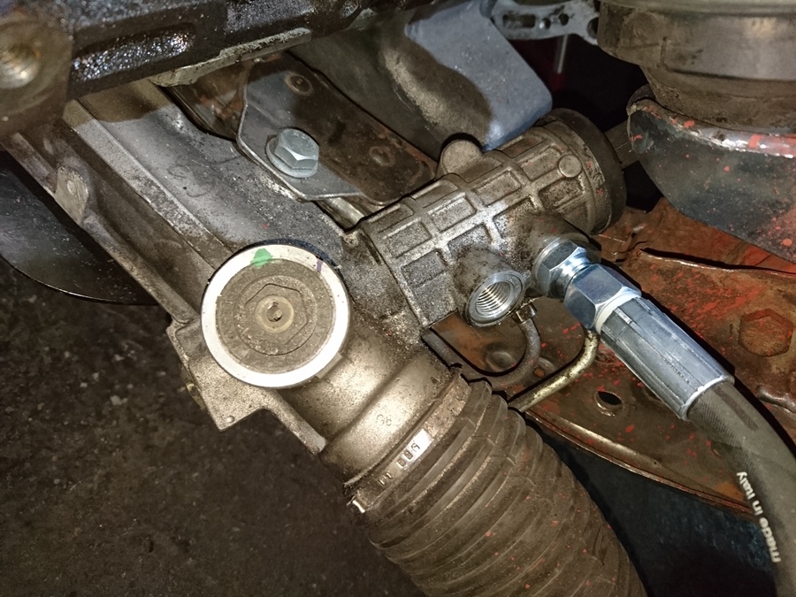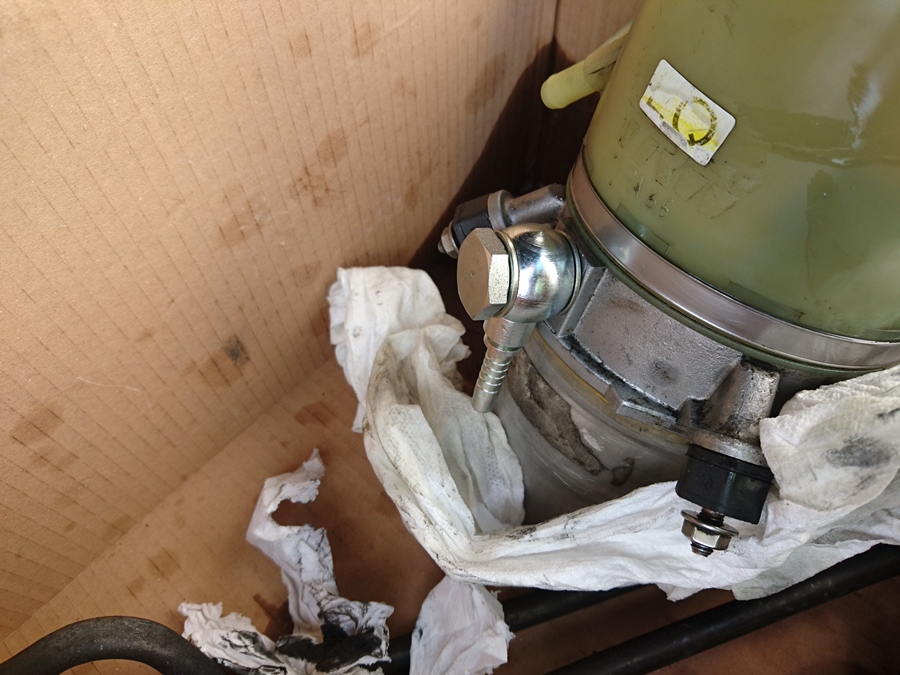 Con la bomba de dirección pensé que iba a tener un problema encontrando alguien que me hiciera un latiguillo con la misma conexión de presión de serie, pero por suerte la bomba tiene un planillo y parece funcional el montarle un racor de ojo. Todo será que fugue cuando arranque el motor... :confused: