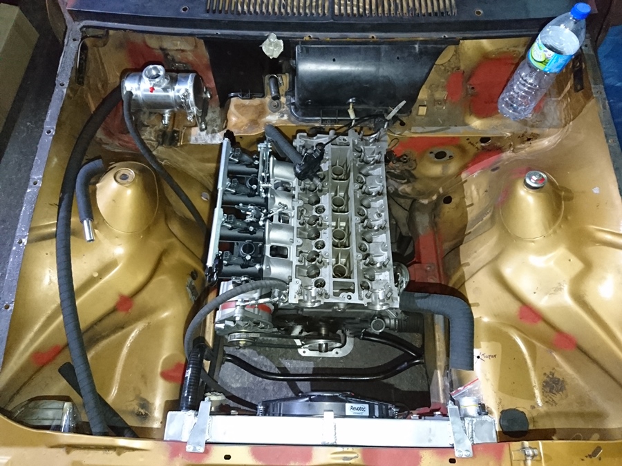 Por ejemplo aquí voy a tener que abollar un poco el cortafuegos para ganar 8 o 10mm de juego para la salida de la calefacción. Otra opción era roscar un racor de 90º en la culata, pero me parece más engorroso y peligroso de hacer.