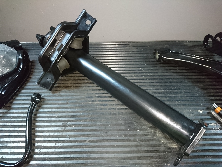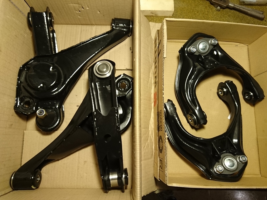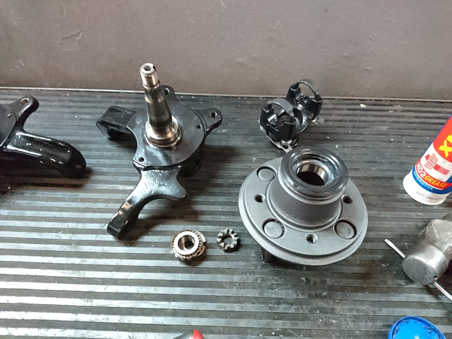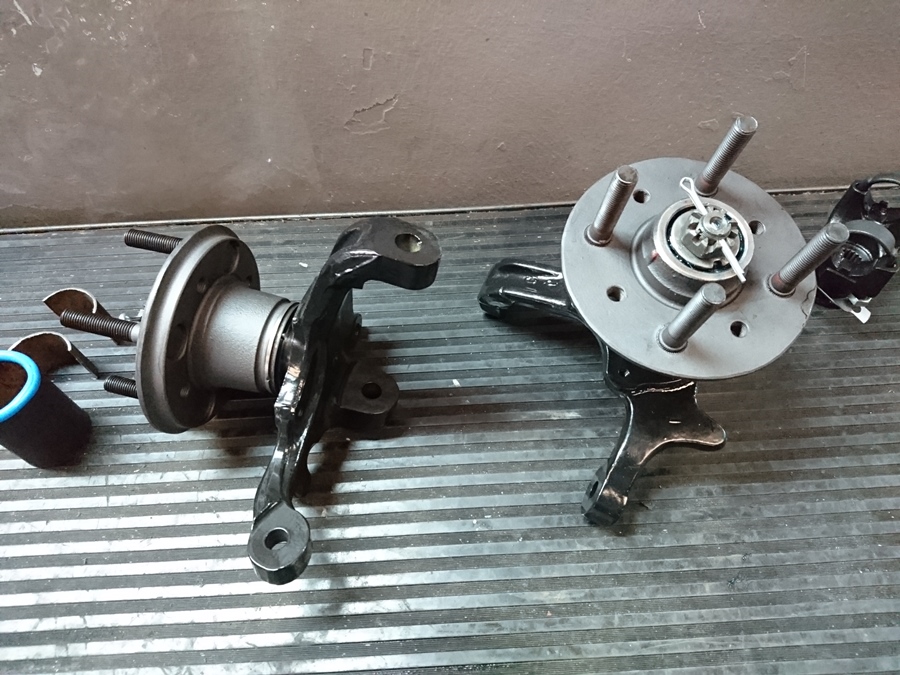 Manguetas delanteras terminadas. Rodamientos y retenes nuevos, bujes metalizados y espárragos largos cambiados en prensa.