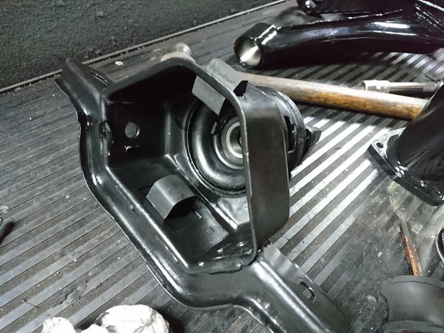 Cuello de transmisión también terminado. Casi morimos yo y mis dedos para encajar los tacos y el donut de goma que lleva. Son de un shore mayor que el original, y no hay dios que los ceda. Le he montado además 2 silent-blocks en forma de cilindro, que son también mucho más rígidos que el taco en forma de V original de estos puentes.