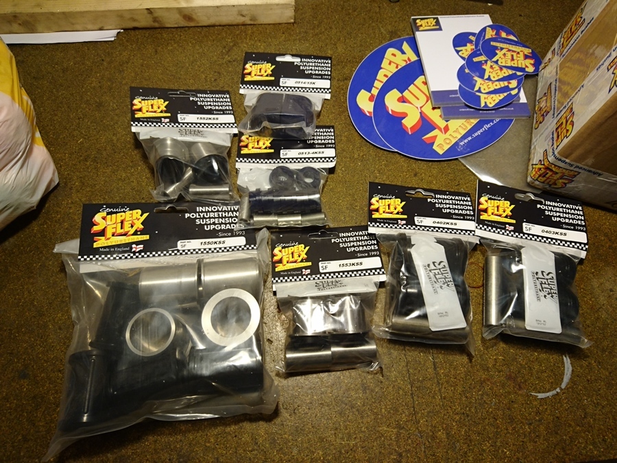 Trapecios acabados también, menuda odisea para montar los Superflex. Eso sí, la calidad que tienen visualmente es bastante mejor que los Powerflex o M-Tech que había montado anteriormente en otros coches. Los casquillos, que otras marcas no traen, son de inox. Los tacos traen moleteados interiores y canales exteriores para almacenar la grasa y facilitar el giro. Son bastante más caros, pero si la duración y funcionamiento es buena, debería merecer la pena.