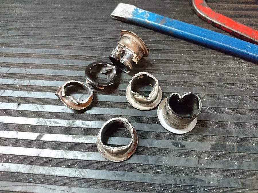 Lo primero, y antes de mandar a pintar los trapecios, hay que sacar los casquillos originales. Como véis, de manera algo destructiva... xD