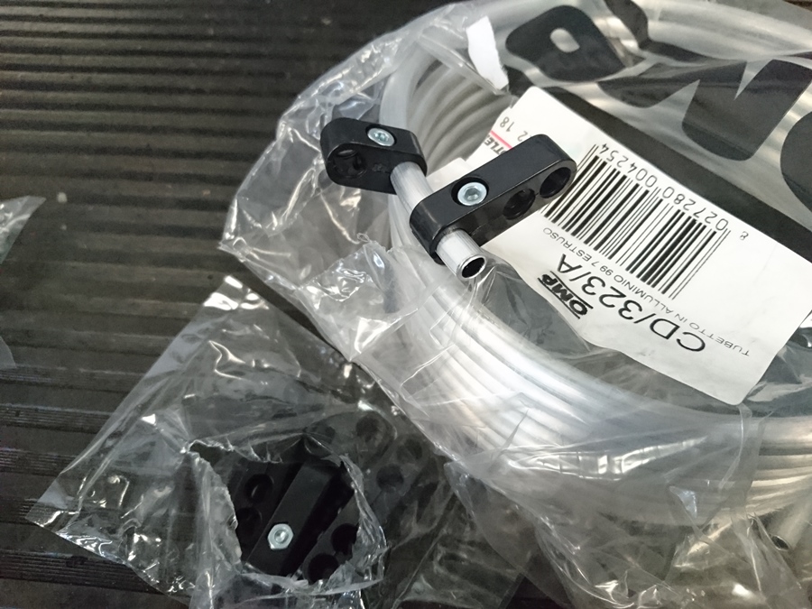 Para aumentar tamaño de la línea de gasolina bajo el coche, lo mejor que he encontrado es línea de extinción de aluminio, que tiene 8mm de diámetro exterior. La sujetaré por debajo al coche con unas grapas que se venden para unir los cables de bujía, que precisamente son de 8mm. Aprovechando que las grapas las hay de 2, 3 o 4 agujeros, me valdrán también para llevar la línea de freno trasera y que quede todo bien ordenado por debajo.
