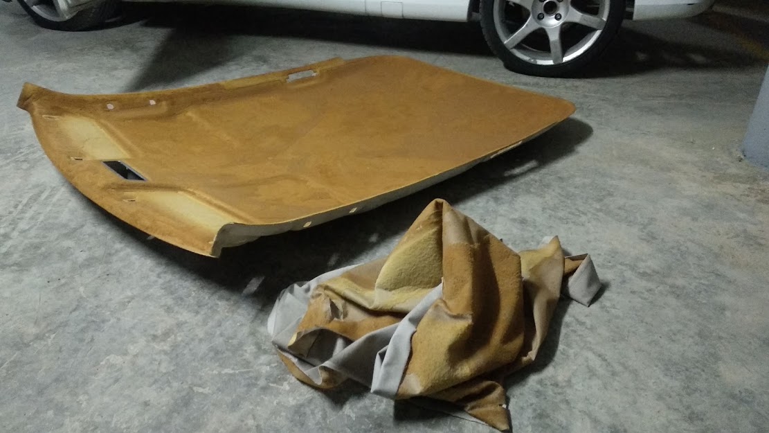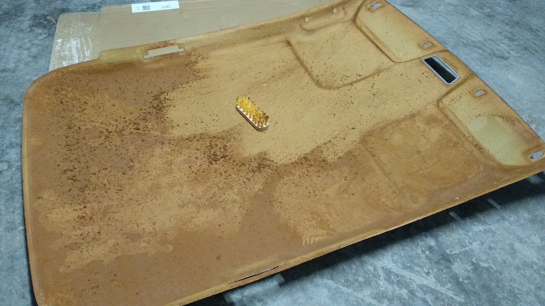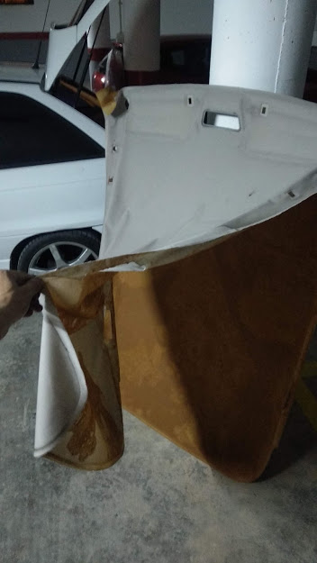 De momento he empezado con el interior. El techo se desprendió completamente, cosa que no me sorprende despues de 25 años. El tapizado se había convertido en una bolsa horrenda colgando.