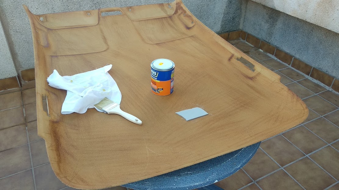 Limpieza a fondo con cepillo gordo y luego otro mas fino para terminar. Después, una vez presentada la tela (30€ 2 metros lineales), un bote de cola y brocha para aplicarla. No me extiendo en esto, ya que no tengo fotos del proceso y hay miles de tutoriales en youtube.