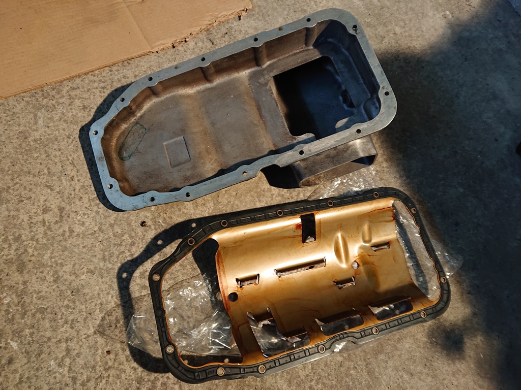 Aquí se ven los varios cortes que tuve que hacerle a la chapa. Además aproveché a calibrar de nuevo la cala de aceite, porque varían bastante las marcas MAX y MIN originales con las que tengo en éste cárter.
