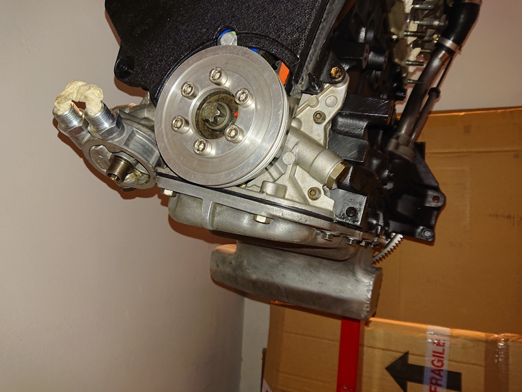 Aquí se ve cómo queda el cárter enrasado con el bloque, para que pueda bajar por ese lado el colector de escape.