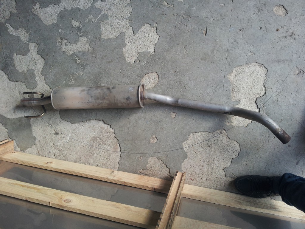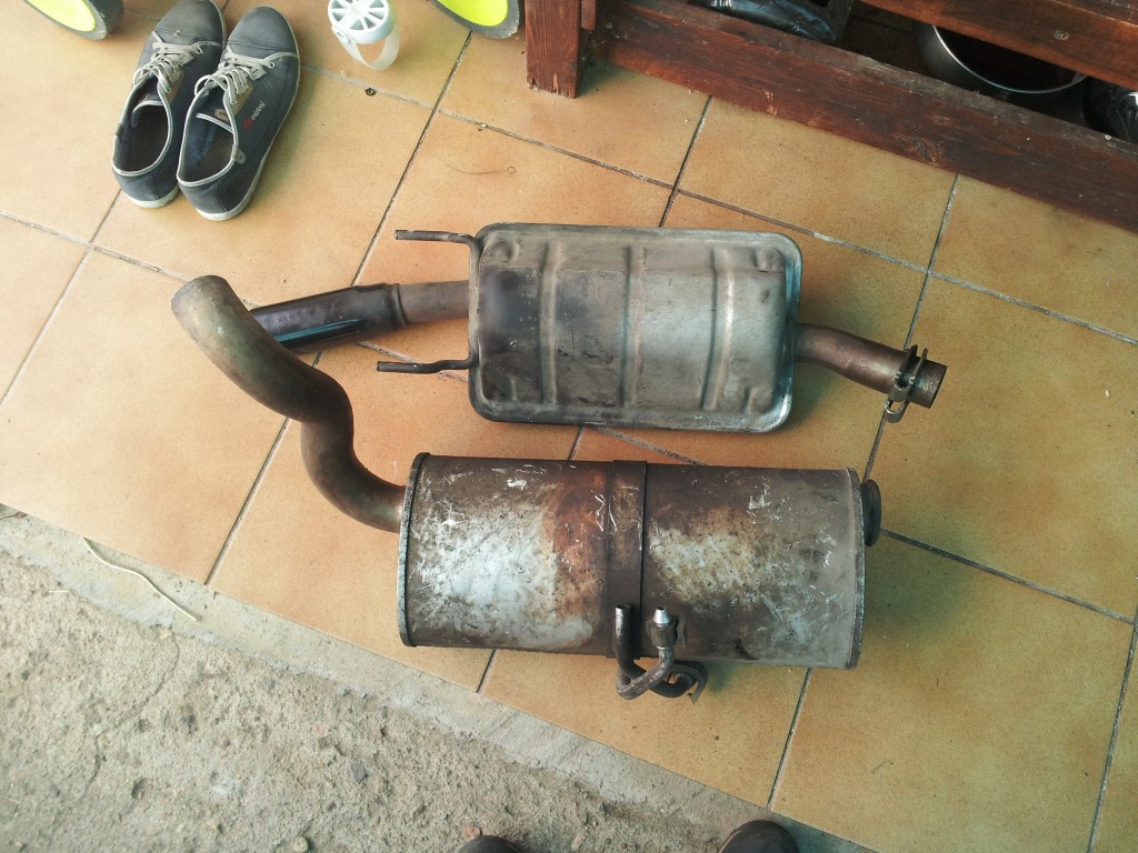 Con esto terminado, solo me quedan dos cosas importantes por hacer: El dichoso tubo de escape y los frenos. Para el primero no se aún como lo voy a hacer...tengo el material, pero no la idea. No soy bueno soldando. No tengo elevador. Y un soldador no puede venir adonde tengo yo el coche para ver como lo hacemos....así que creo que intentaré aquello de hacer cortes en el lateral del tubo para dominarlo y hacer las curvas...aunque no se si saldrá bien... Por otro lado el silenciador ya lo tengo. He comprado en el desguace uno de Citroen Berlingo 1.9 Diesel. La boca es casi el mismo diámetro que la downpipe y me cabe (creo) en el hueco del silenciador del Tigra.