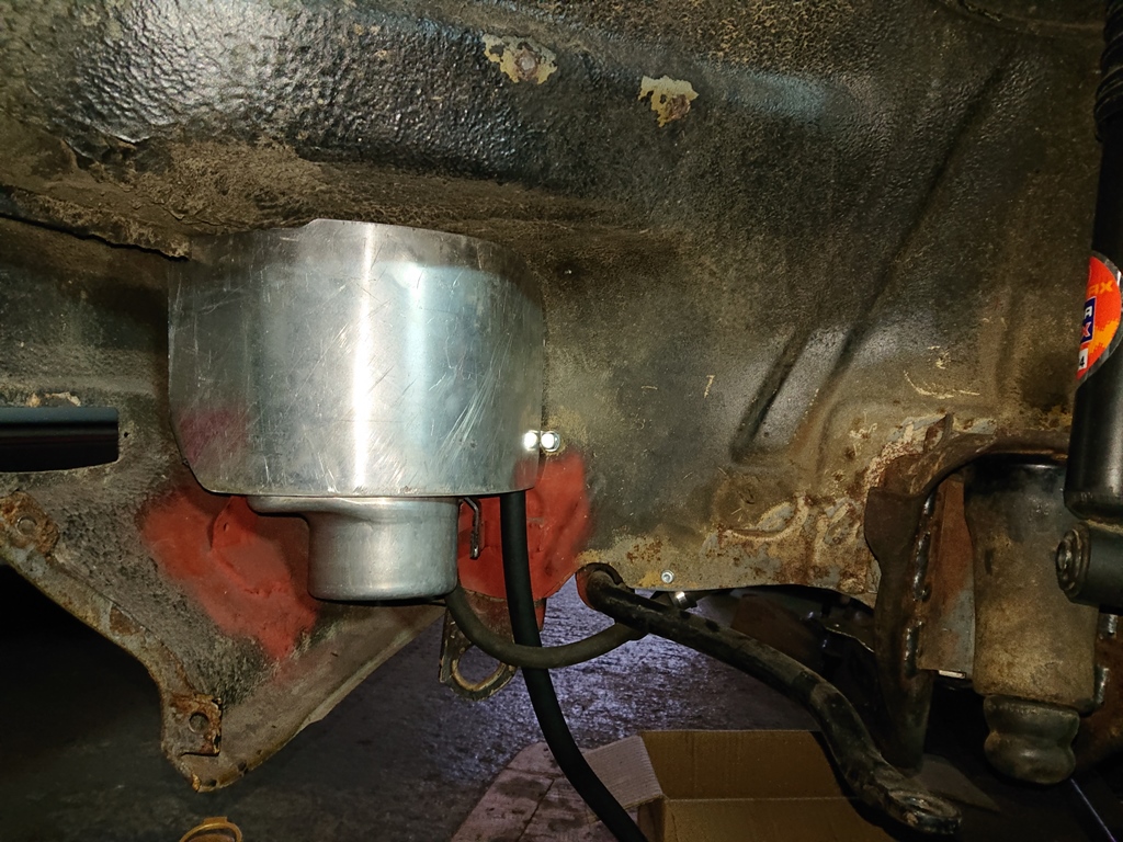 Así ya tengo ambas salida y retorno de la medida correcta. Y como la bomba va muy expuesta al agua de la rueda, le he hecho una cubierta de aluminio para que la proteja bien. Con un perfil en U de goma por arriba queda sellado contra la carrocería.