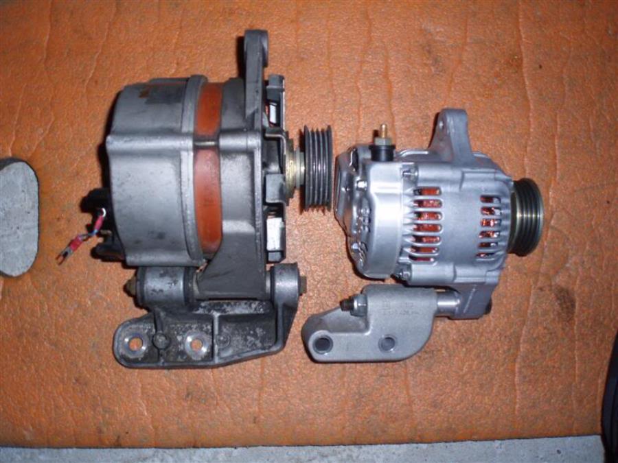 La idea era montar un pequeño Denso de los que llevan algunos pequeños tractores o retropalas, como el de la foto de debajo comparando con el de origen de c20xe. De hecho es el mismo que vende SBD en sus kits. El pero es que no dan más de 40A y, aunque hay algunos que venden preparados con hasta 70A, nunca cargan bien a bajas vueltas y el apoyo del alternador para la tensión que pide la correa no lo veo adecuado. La bomba de dirección de Astra G he visto en TIS que pide picos de 75A y eso tira en la correa...