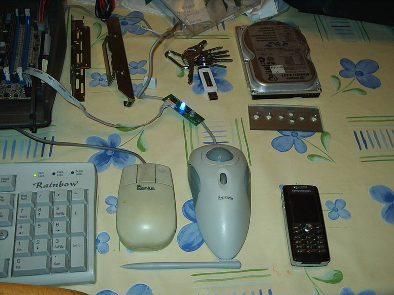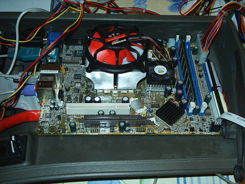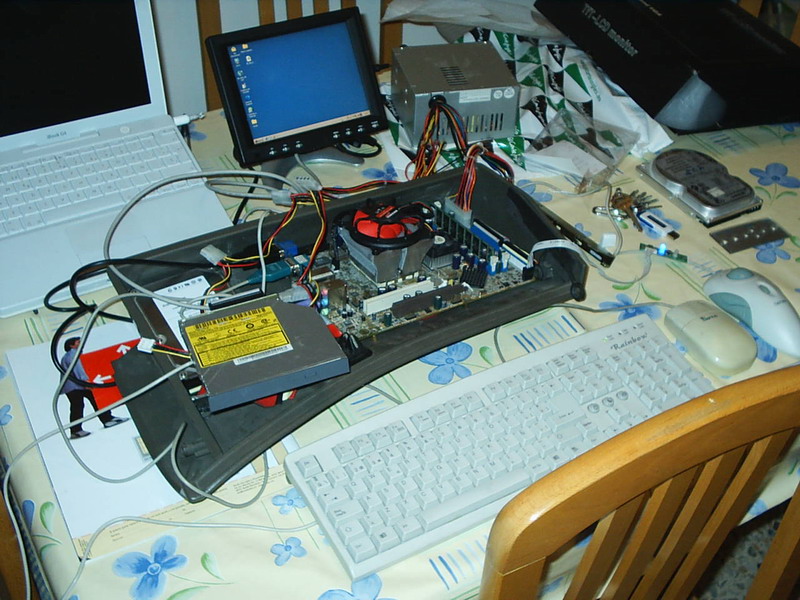 Placa con su micro, cooler, ram, disco duro de 60 gb, lector dvd un ratón y teclado cutres y el trackball que seguramente llevará, una de las pantallas (la táctil) y a rular, lo he estado probando dándole mucha caña y así se queda para ver temperaturas y demás.