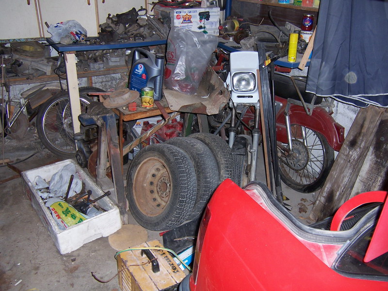 Hemos metido el coche al foso, lleno de valiosos trastos: piezas del 600, motos antiguas...