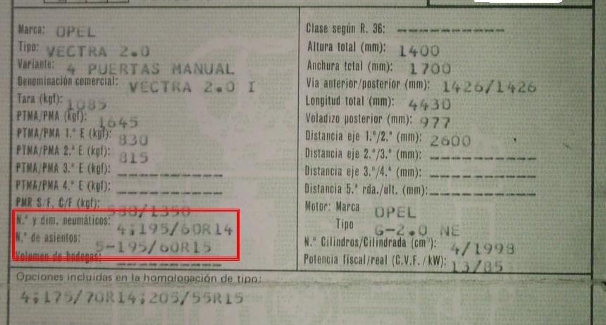escarpa, saca la ficha de itv. Tendras algo parecido a esto y te marco donde tienes que leer para saber la rueda que saca de fabrica tu coche (no te hablo de equivalencias ni de tablas ni de hiostorias raras, las ruedas que saca de fabrica) . Aqui la imagen: