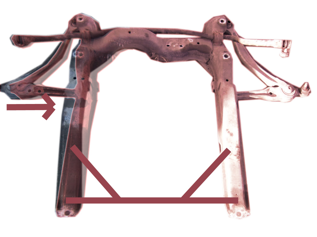 Mira, he hecho un pequeño esquema de qué le ocurre a un subchasis de Astra F bajo cargas laterales, y cual es la deformación a la que se enfrenta y la forma de paliarla. En rojizo (exagerando), tras someterlo a una carga lateral (curva). He puesto también las barras para que veas de que forma afectan. De igual forma que aportan rigidez, es una cadena, el subchasis "guía" a la carrocería: