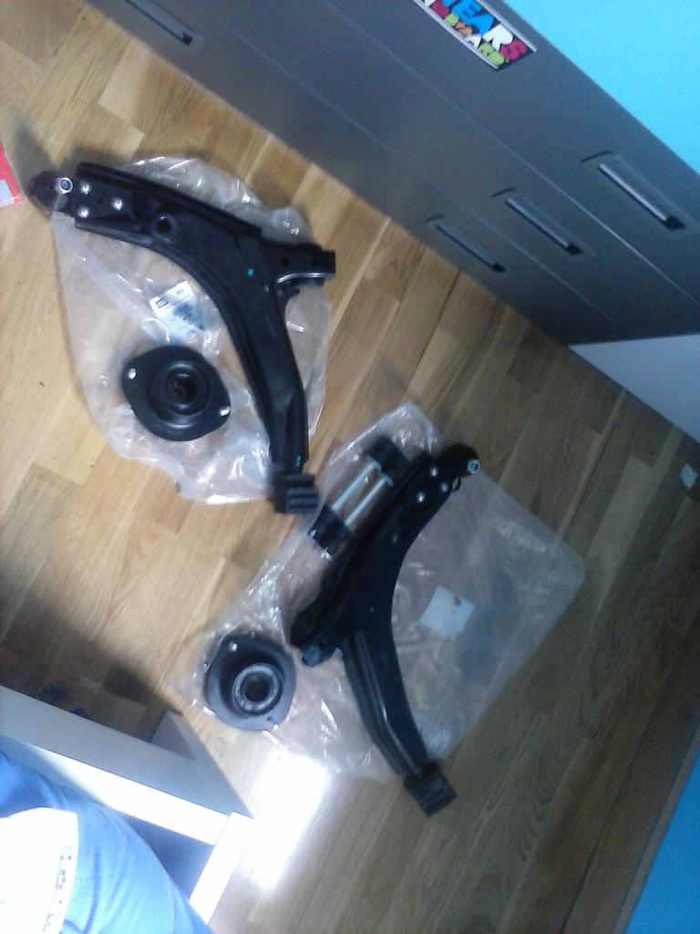 Los rodamientos delanteros estaban mui cascados, y solte las manguetas y se los cambie los dos. Ya que tenia que soltar los platillos que cubren el disco, aproveche para petrolearlos un poco y sanear el oxido un poco. el coche no traia tirantes de la estabilizadora, asique pedi unos por internet, y de paso pedi los brazos de suspension nuevos, porque los viejos estaban oxidados y las gomas y rotulas un poco tocadas, y las copelas tambien, porque al soltar las manguetas me di cuenta que tenian mucha holgura, pero se las pondre cuando cambie de suspen.