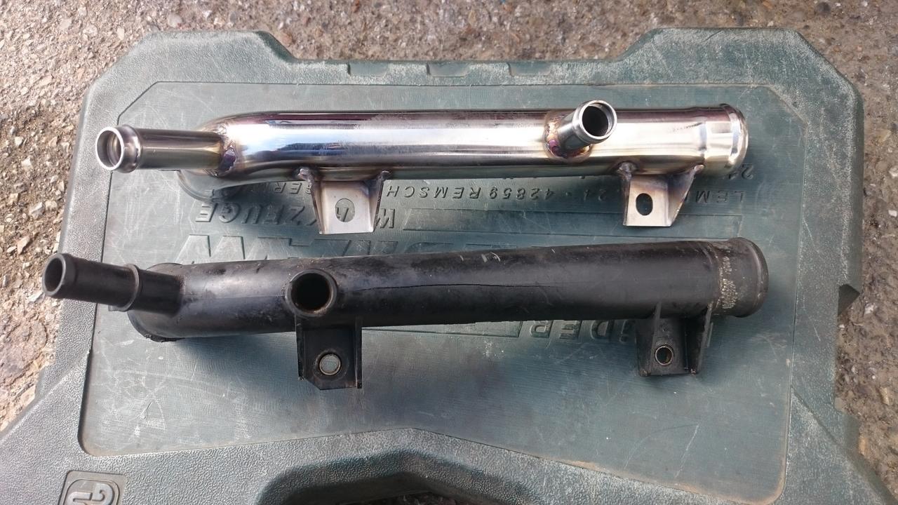 Seguimos avanzando, sin prisas pero sin pausa... cuando monte el motor no quise cambiar la "L" de plástico por la que se vende de acero inoxidable por no ser 100% igual, pero tras varios arranques y llegando a su temperatura de servicio me encuentro con que se ha rajado, me he visto obligado a cambiarla y el trabajo extra por no hacerlo en su momento, decir que aunque no vaya en sus cogidas originales (una de las tuberias del radiador de calefacción) no obstaculiza nada ni roza en ningún sitio, también tiene montada la linea de escape con su terminal original, y poco más, esta semana que entra va a la itv a ver que tal se porta....