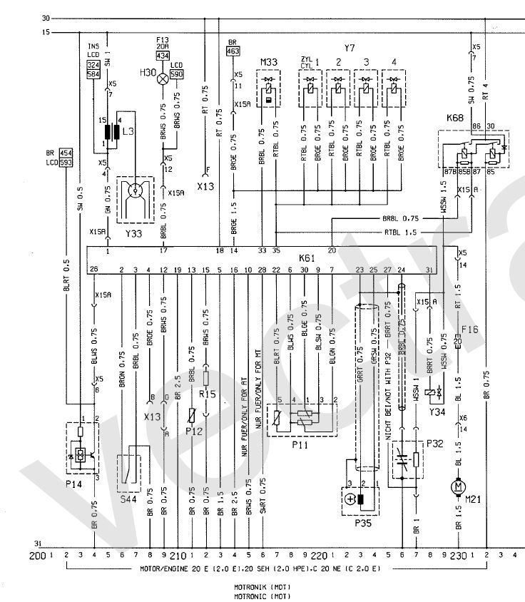 La centralita se alimenta a través del pin 20, que viene del relé de la bomba (cable Marrón-Azul, viene del pin 85B del relé, pasando por el conector X15A (conector de la inyección, 10 pines).