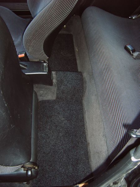 Aqui las alfombras traseras, que me hice de una pieza... compré moqueta en el leroy merlin, tomé medidas, y por 3,95 € y un buen cúter y regla, te las haces tu mismo en un ratito... 100% recomendable. Estoy hasta por hacerme la version "racing" en moqueta roja, como el type-r jejeje.