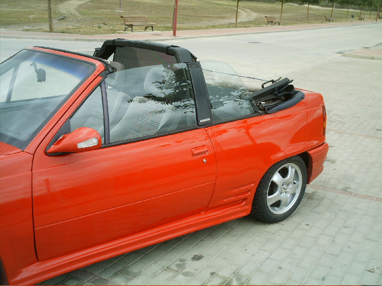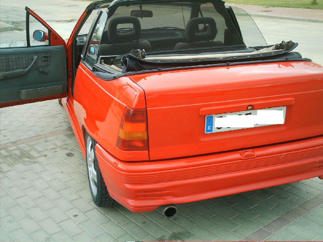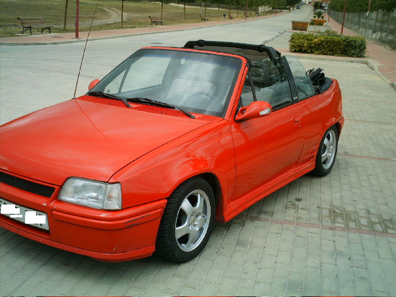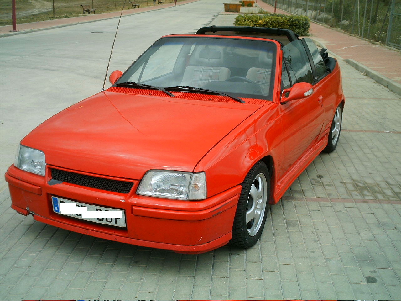 ¡Diabadabaduuuuuuuuuuu! Tengo un Kadett Cabrio 1.6i, catalizado y automatico. "La Calabaza" está cerca de cumplir los 20 añitos, todo un chaval, y fue traido de alemania hace 8 años. Repintado en color rojo Mazda, tiene todos los bajos y la capota azul marino en perfecto estado, aunque hubo que cambiarla, al igual que el radiador, que fue mejorado y añadido otro para el aceite de la caja de cambios. Llantas de 15 pulgadas, con unos donuts 205 y perfil bajo y una suspension deportiva Koni regulable.