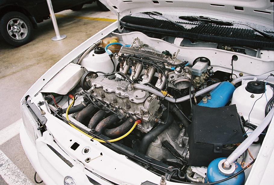 lleva algo parecido a un lexmaul para motor 16v pero o no es lexmaul o esta modificado (a parte de estar al reves). tiene unos cuanto detalles extraños: no lleva distribuidor, coge el aire directamente del vano sin filtro ni tubo ni nada, tiene un cable de bujia de otra madre, un catch tank manguera de jardin-style, presostato de gasolina regulable, colectores gordos