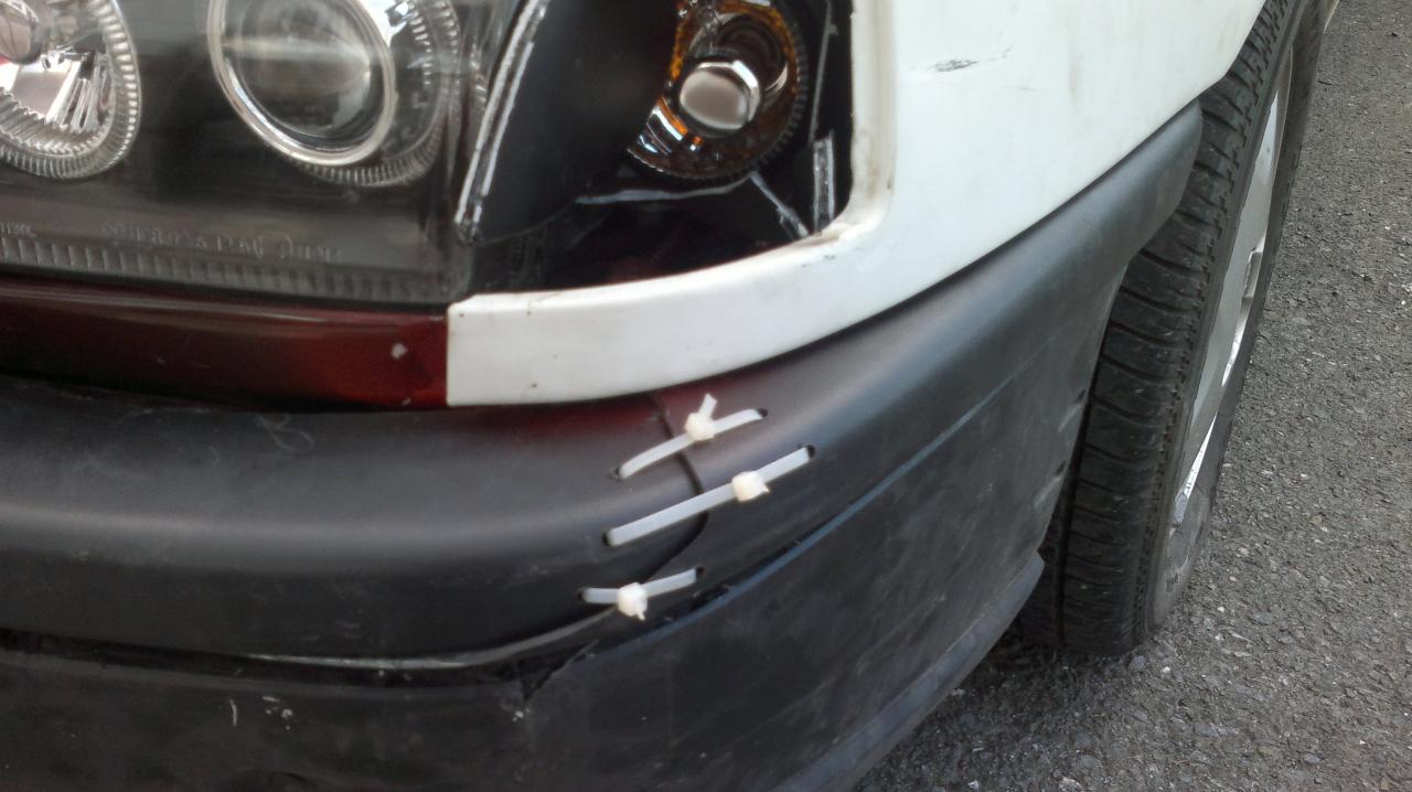 despues de desmontar la aleta, sorpresa: larguero doblado!!!! sin problema, se estira y se compra una aleta nueva, y de paso le hago un apaño al paragolpes