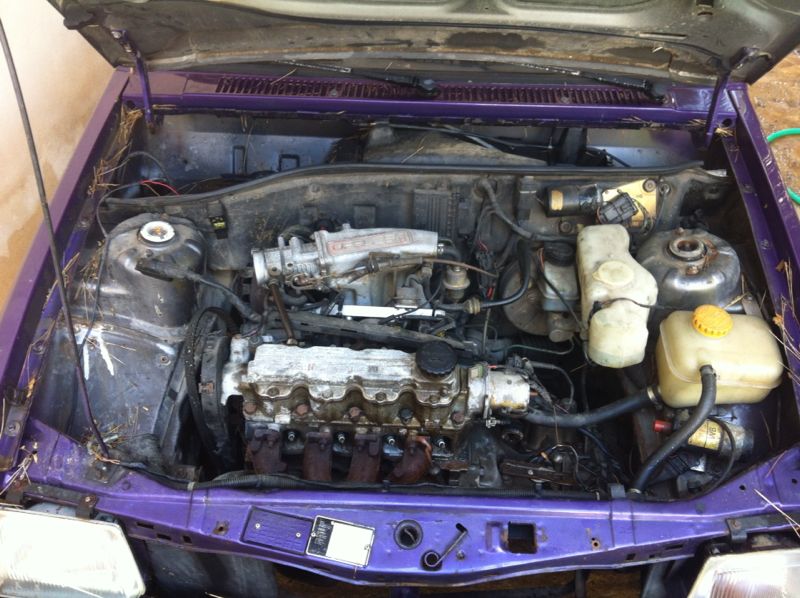 El color de serie como podéis observar era gris fuerte, fue repintado de ¿lila?... y la idea es pintarlo de blanco, ponerle unas llantas majas, reconstruir el motor, ponerle árbol de levas, algo normal, no de competición pura, unos colectores, quizas grupo corto, suspensión y frenada decente y lo que más miedo me da...resoldar/reforzar chasis, con su correspondientes barras antivuelco.