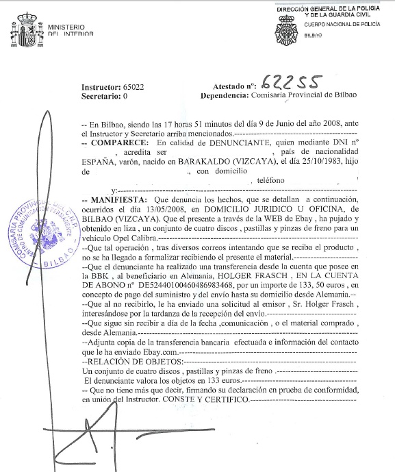 4º.- Ebay remite los datos necesarios para que yo realice la denuncia ante la policia.