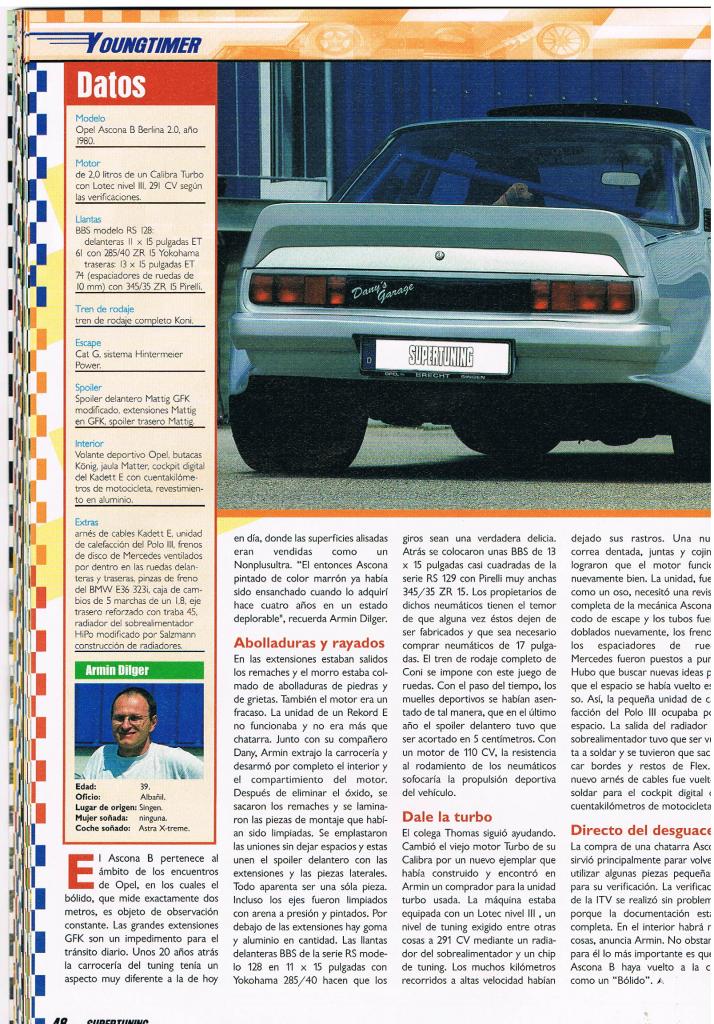 Llevaba tiempo buscando este reportaje que recordaba tener guardado entre los montones de revistas para compartirlo con vosotros y al final hoy a aparecido.Es un Ascona B anchísino y letizado,está sacado del nº8 de la revista Supertuning del año 2003.No sé si está bien puesto aquí,si algún moderador quiere cambiarlo de sitio....Clic en la imagen para ver su versión completa.