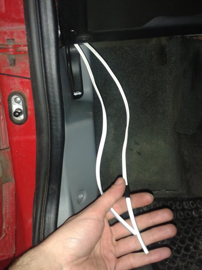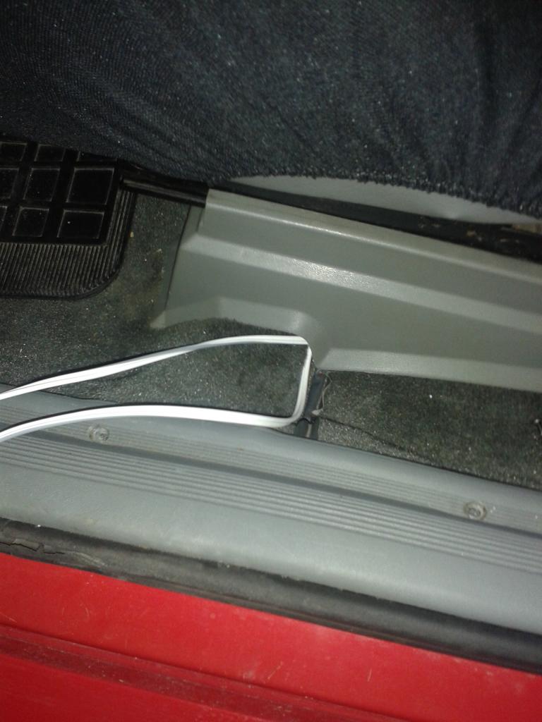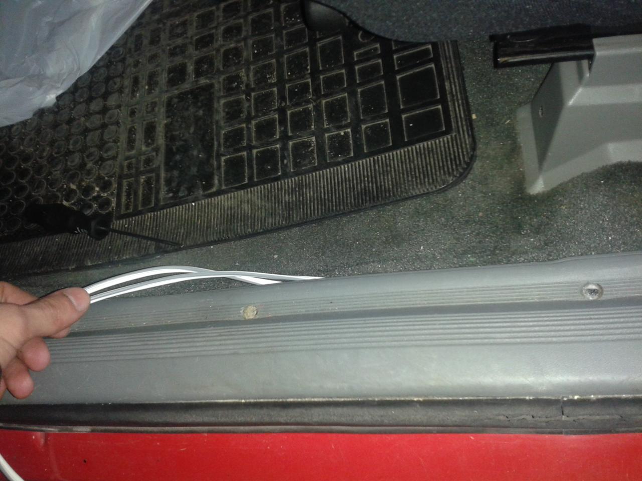Pasaremos 2 parejas de cable paralelo por debajo de la moqueta del asiento para llegar a las guías de la puerta y las meteremos por debajo, muestro fotos: