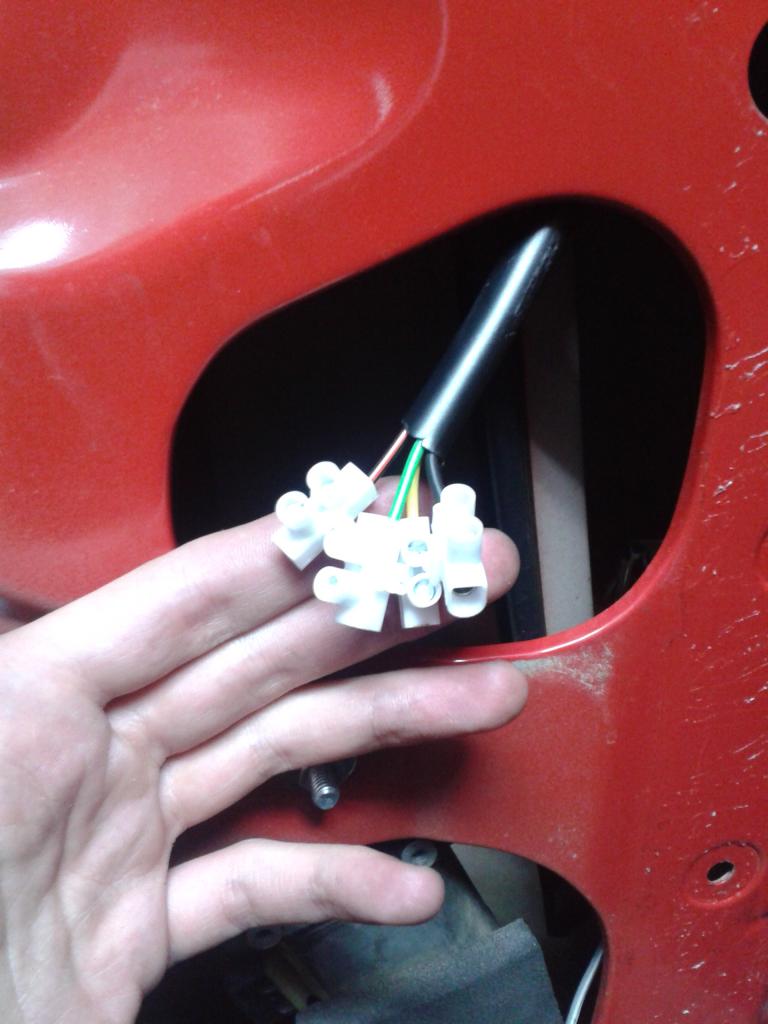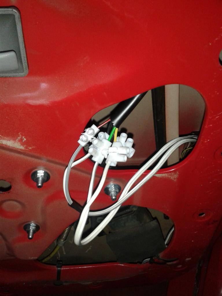 Tampoco se ve como has pasado los cables del coche a la puerta, pero si no has utilizado el conector redondo original y los has pasado por un agujero antes o despues esos cables se van a romper/desgastar. Viendo que te mueves por los desguaces sacate un par de conectores de puerta y les sacas los pines y los metes en tu conector, eso dura de por vida y sin fallos.