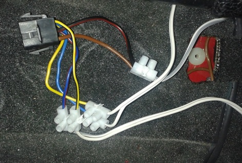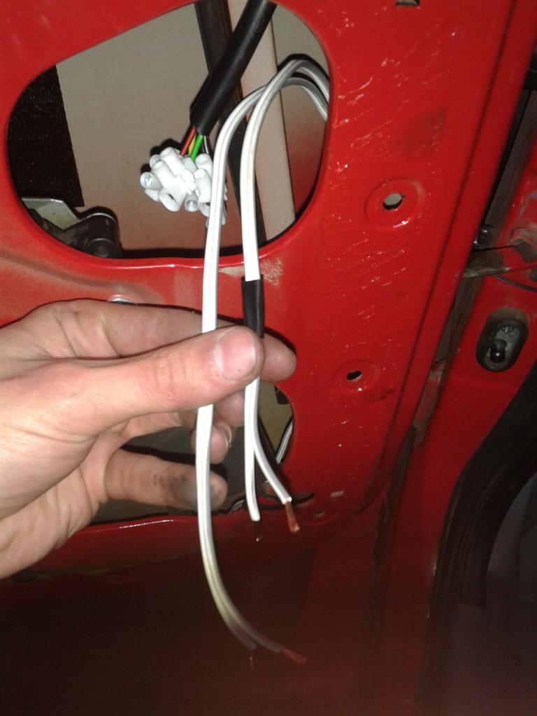 Una vez identificados los cables se conectan cada uno en su sitio (podéis usar cables de diferentes colores para que sea mas fácil, yo use todos blancos jeej), solo he hecho funcionar los motores eléctricos, el calefactado no, aunque el cableado está hecho para funcionar también el calefactado, 3 cables son para los motores, 1 para positivo de calefactado y el cable que sobra del espejo se conecta a masa en la propia chapa de la puerta con un tornillo: