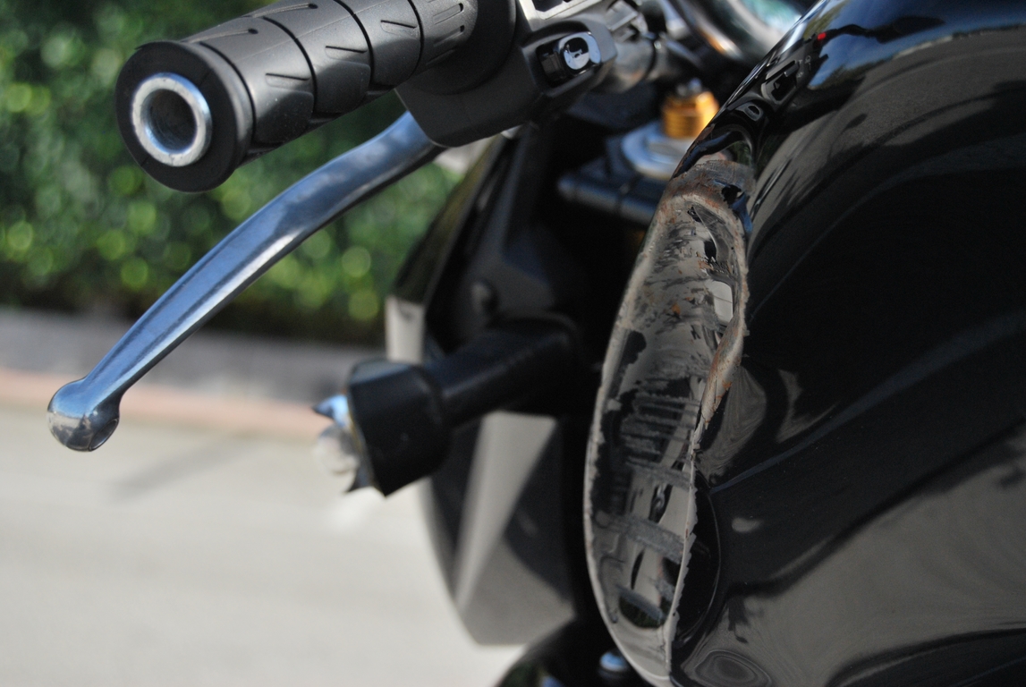 Así es como estaba cuando la compré: Barras dobladas, careta rota, guardabarros pa cambiarlo, y además tenía el carter roto. También estaba rallada en la parte izquierda y un bollo feísimo en el depósito.