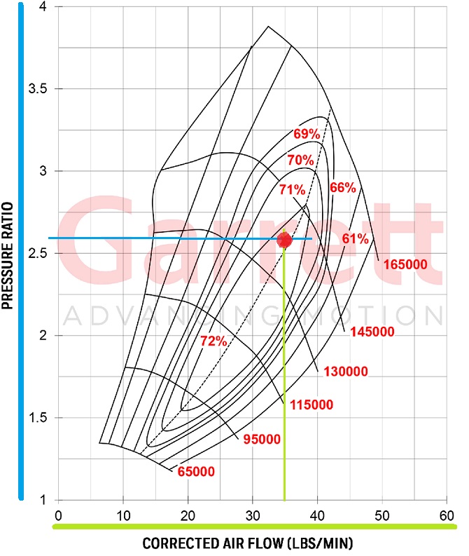 Respecto al mapa de compresor que ha puesto Tiparraco, si el punto de trabajo es el de potencia máxima veo el turbo un poco demasiado grande. trabajar en el punto de eficiencia máxima a potencia máxima debería ser lo ideal, pero si vas tan "sobrado" a potencia máxima debes estar muy cerca de la zona de bombeo a bajas vueltas y plena carga, aparte que ahí la eficiencia cae. Haría falta ver la línea completa, no solo un punto de trabajo.