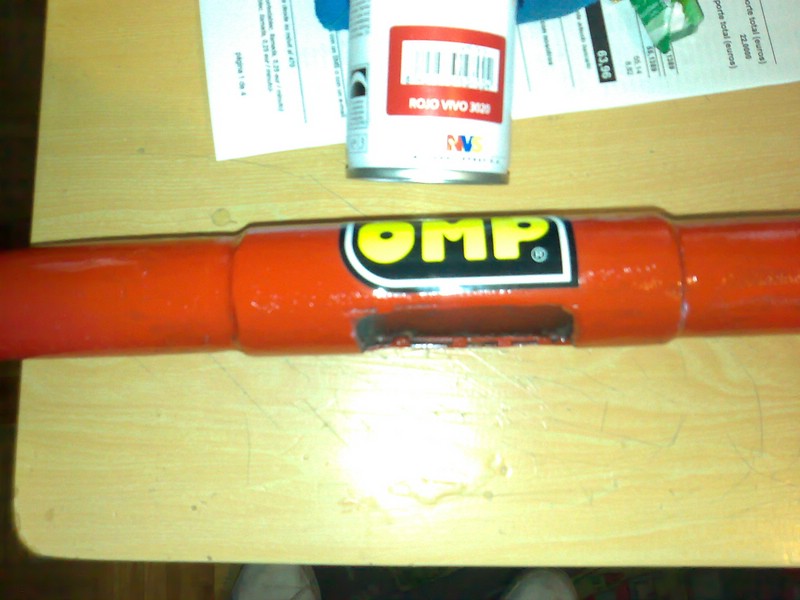 Lo que se ha hecho es soldar un tubo sobre tubo para reforzarlo mucho mejor, luego lo he pintado del mismo color que la barra para dejarlo bonito y ale, una pegatina de OMP para que quede un trabajo fino fino.