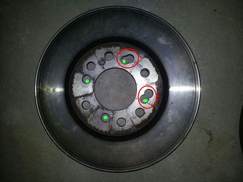 La leche, esos discos tienen más agujeros que un colador.... Es una pena, pero todos los discos de 5 tornillos traen 7 u 8 agujeros, y al retaladrar queda así.... no tiene por qué pasar nada, pero que coincidan 2 agujeros.... da un poco de yuyu
