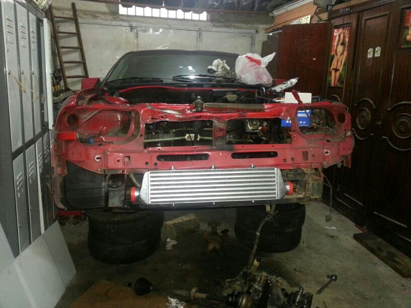bueno ya puedo abrir un post en swaps! hoy me dedique a desarmar el coche para reparar lo del golpecillo y presentar el intercooler y revisar lo que habrá que cortar de la defensa. El intercooler me cabe como yo quería pasando los tubos entre las punteras ganando así mucho en recortar recorrido y espero que lag con ello. pronto tendré las cosas necesarias para despuntear el frente y poner el nuevo y luego ya será todo montar mecánica