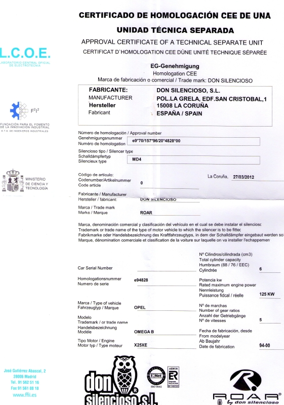El q tenga una inscripción de homologación en este caso no es valido solo con eso. Todo ha de estar homologado, pero en el caso de los escapes ha de marcar para q. Me explico, el escape de competición tb tiene homologación, pero only for racing pourpose, como suele poner. Por mucha homologación q tnga eso troquelado no es valido pa la calle. Por lo tanto es obligatorio algo q demuestre que es apto para calle y a la vez para confirmar que sea apto para el vehículo donde se encuentra instalado.