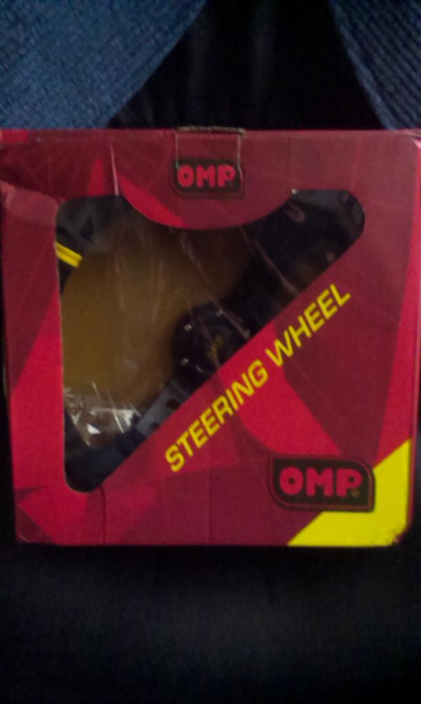 Volante OMP de piél vuelta. 350mm de diámetro, 90mm de desplazamiento. De momento no lo voy a montar, ya que tengo que comprar la piña todavía, y tengo cosas mas importantes en las que gastar ahora mismo, pero el volante era una buena oportunidad y no quise dejarla escapar.