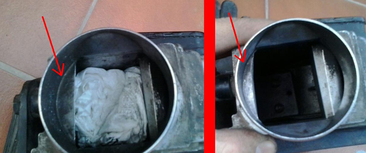 - Caudalímetro: si bien tengo aún el caudalímetro de recambio en pleno proceso de modificación para su posterior prueba, el caudalímetro que tengo montado en el coche también lo modifiqué ligeramente, tocando únicamente el canal de salida puesto que ahí no me comportará ningún problema de lectura y el paso de aire ampliará ligeramente. Se podría haber rebajado algo más pero al ser el único caudalímetro bueno que tengo no me la quise jugar, para eso tengo el otro. Foto del antes y del después: