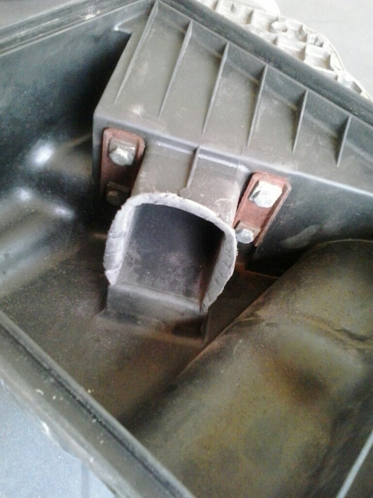 - Caja del filtro de aire: la parte de arriba de la caja tiene un tubo cuadrado por el que el motor aspira el aire; quería cambiarlo por una trompeta de admisión con la finalidad que el coche aspirase mayor cantidad de aire y éste a su vez entrase a mayor velocidad, sin embargo después de mirarlo y hacer diversas pruebas con aluminio se me hizo complicado pasar del tubo cuadrado a la sección redonda de la trompeta, y los resultados no eran óptimos, de manera que finalmente calenté con cerillas el tubo cuadrado para darle forma de trompeta, no es un gran avance pero creo que irá mejor que con el tubo cuadrado de origen: