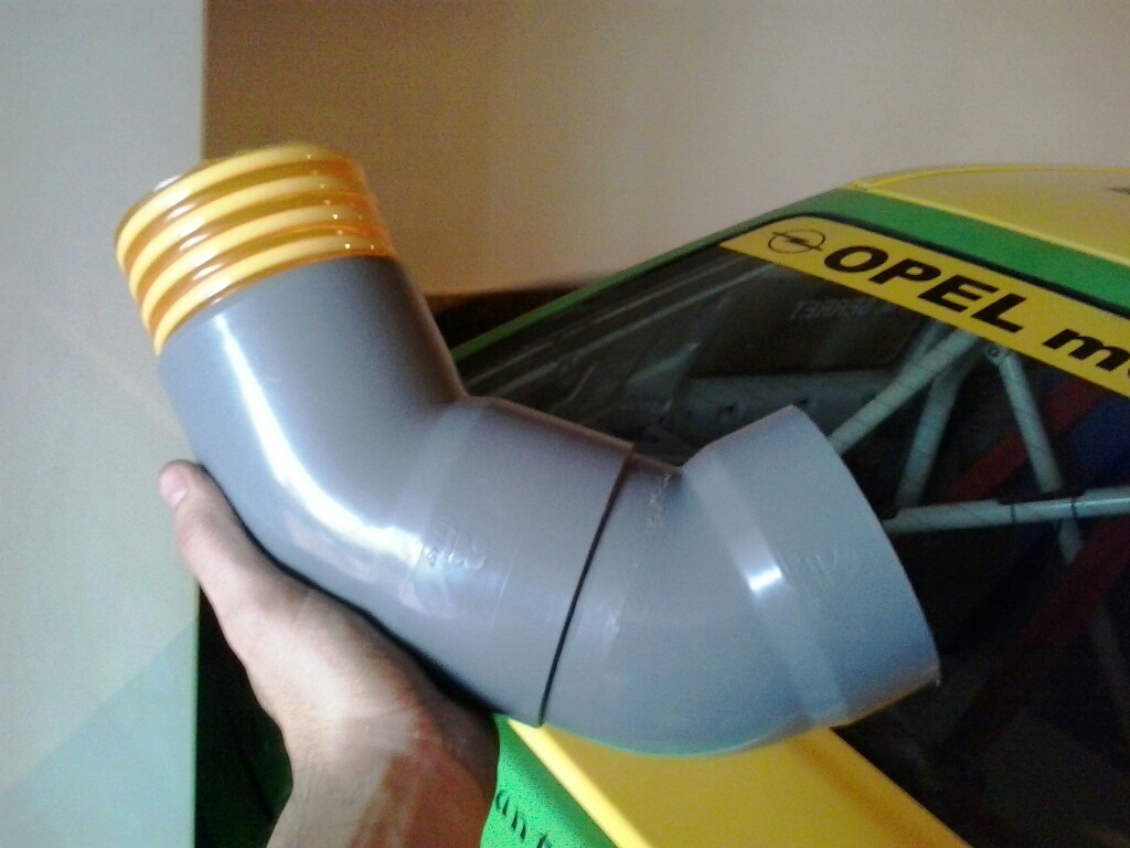 De la campana pasé a tubo de 10cm puesto que es el diámetro del agujero que hay en el chasis y que da a la caja del filtro de aire. Estuve buscando tubos de 10cm flexibles y lisos por dentro (para evitar al máximo las turbulencias) pero poca cosa encontré, con lo que finalmente me hice con dos codos de canalera de PVC de 45 grados, y un trocito de tubo de 10 para pasar por el hueco del chasis (el Pvc no pasaba por poco). Lo pegué con pegamento especial y lo encinté para que no se viese que son tuberías de PVC. Estéticamente no es la monda, pero creo que la cantidad de aire que pueda coger va a ser mucho mayor que con el tubo de 7 que llevaba. Eso sí, tube que modificar ligeramente la caja de debajo del filtro de aire.