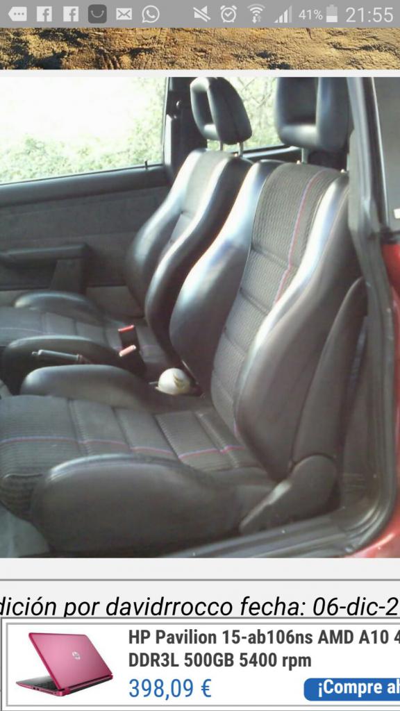 Son telas para coche que tenían muy buena pinta. La idea sería tapizar las orejas del asiento en polipiel negra y el centro en tela normal gris. Algo como lo de la foto que es como esta tapizado el 16v. Algo así sería mi idea pero bueno tendré que madurarloClic en la imagen para ver su versión completa.